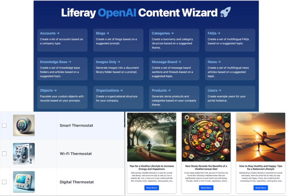 在 Liferay 中產生內容時,我們喜歡收集與客戶的業務垂直、提供的服務和預期結果相符的內容。抱歉,「lorem ipsum」並不能解決這個問題。這可能需要花費大量的時間和精力,並可能分散其他責任。對於複雜的結構,例如產品、知識庫或留言板,通常需要耗時的研究才能創建提供有影響力的結果並感覺「真實」的內容。