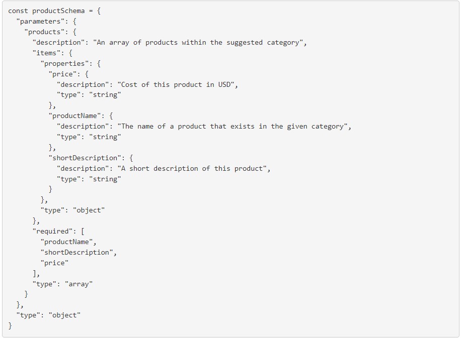 至關重要的是,每次傳回的 JSON 結構都相同,以便能夠正確儲存資料並捕獲格式中的任何錯誤。簡單的字串解析不行!為了確保傳回的結果完全是正確的 JSON 結構,OpenAI 提供了函數呼叫。在我們的例子中,我們需要定義模式來描述需要傳回的內容。以下是此方法中使用的產品架構範例:
