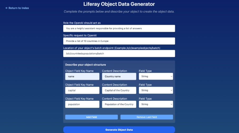 透過這次旅程,我們發現,如果正確整合,我們可以使用生成式人工智慧來創建複雜的資料結構。 Liferay 支援一種視覺化、低程式碼的方法來建立資料結構,自動建立一整套Headless API。我對與團隊合作進行一個專案感到非常自豪,在該專案中,我們將生成式 AI 與Liferay 的 Headless API相整合,以實現自訂資料結構,從而在短短幾秒鐘內生成一個地區內的縣和人口列表的資料集。這可以應用於對我們合作的團隊有用的任何主題或主題,結果是無限的。