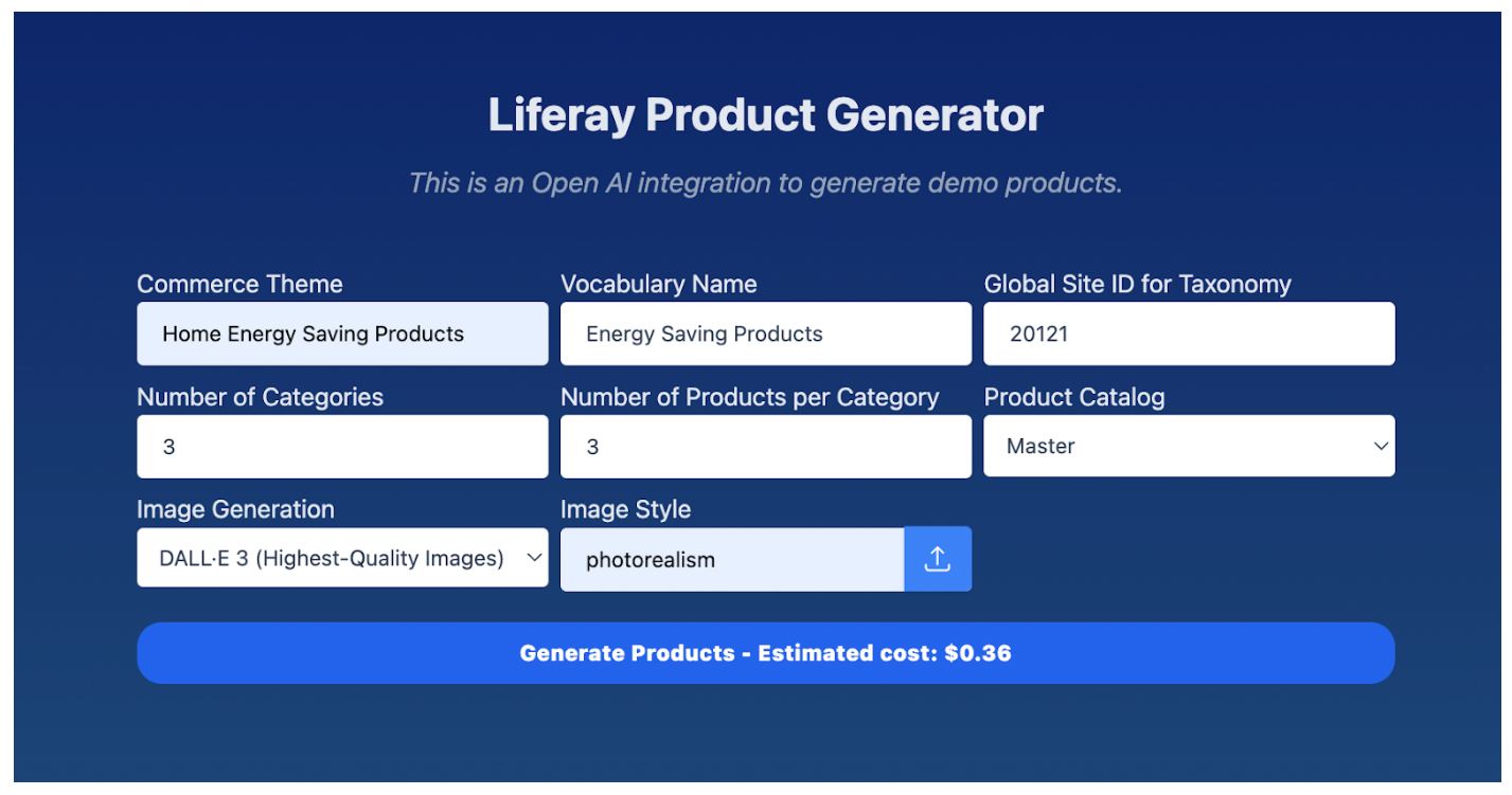 使用一些常見的開發技術,我們製作了一個簡單的產品生成器介面,團隊可以使用該介面在 Liferay 中快速建立初始範例內容。此介面允許使用者輸入 OpenAI 提示並根據提示中的資訊接收產品詳細資訊。由於與 OpenAI 的整合金鑰,產生的內容是可能的。