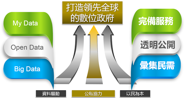 第五階段電子化政府規劃重點將以資料導向之角度重新設計政府服務樣態。以資料驅動、公私協力、以民為本為政府服務的核心理念,並以巨量資料(Big Data)、開放資料(Open Data)、個人資料(My Data)為工具,透過「基礎環境數位化、協作治理多元化、產業營運智能化、數位服務個人化」等四項推動策略,達成「便捷生活」、「數位經濟」及「透明治理」三大目標以及「打造領先全球的數位政府」之願景。